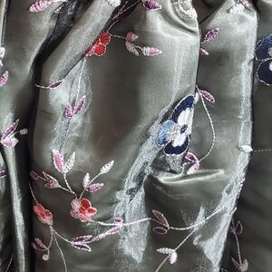 This is a beautiful sleeveless girls tulle embroidered dress features pink, red, blue, silver and purple flowers overlaying a shiny gunmetal fabric. The lining is a light silver gray and zippers in back starting a little below the waist.