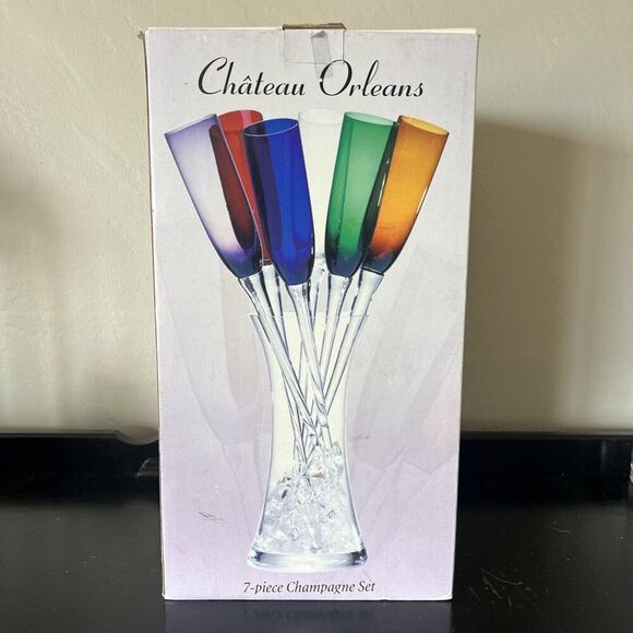 Elevate your toasting experience with the CHATEAU ORLEANS Champagne Flute set, designed to impress with its modern elegance and functionality. Each of the seven pieces in this set, including the Ice Boull Chiller, is crafted from premium glass, boasting a sleek, straight silhouette and a vibrant multicolor pattern that fits seamlessly into any holiday or celebratory decor.