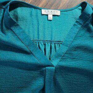 Absolutely beautiful tunic blouse from CHAUS, New York. 100% polyester satin. V neckline. Cap sleeves. Tunic style. Gently loved, laundered and in excellent quality and condition. Super for all seasons...wear alone in warmer months and/or pair with jacket/blazer/suit/cardigan in cooler months. Pleated back yoke. Gorgeous shade of jade green. SIZE L/MEASUREMENTS: pit - pit = 22" x 27" long.