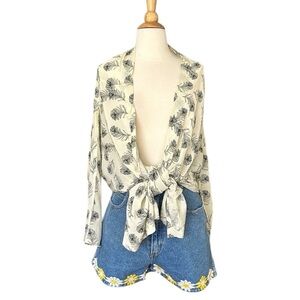 100% cotton no stretch denim jean shorts that feature an embroidered white and yellow floral daisy trim along the hem. They also have a super high-rise with a zip fly and dual button enclosure, five pockets, and wide leg openings.