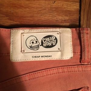 Cheap Monday jeans. Unique color: light washed red. Great to pair with boots, heels or flats. Worn twice. Purchased from urban outfitters.