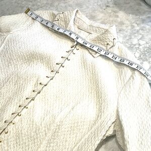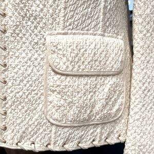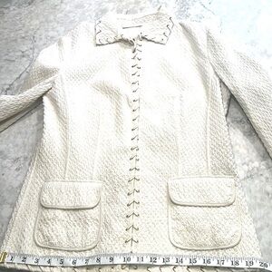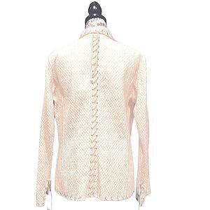 This rare vintage open blazer is a true gem! Crafted from a modest quilted fabric, it features a front braid and gold rivits adorning the collar, front, and back, as well as the sleeves. MADE IN ITALY