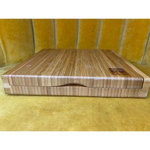 This promo cheese knife and tool set is in excellent new condition and features three cheese knifes and a fork all nestled magnetically within a cozy wooden box that has been engraved with the Cigna logo.