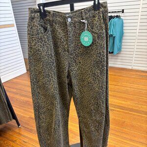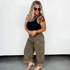 These Barrel Jeans are the ultimate statement piece for your wardrobe. Featuring a bold cheetah print, the Barrel Jeans offer a sleek high-waisted fit that hugs your hips and waist while keeping a comfortable wide-leg shape. Designed from 100% cotton non-stretch denim, these Barrel Jeans keep their structure while giving you a flattering silhouette. The slightly tapered ankle, darted knees, and raw hem that can be rolled up or down make these Barrel Jeans versatile for any look. Pair them with your favorite tee or a chic blouse for effortless style. SIZE UP:MODEL: BLAKELEY: IS SIZE 14 WEARING 15