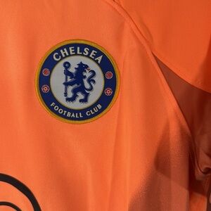 Authentic Chelsea FC Goalkeeper Shirt from the 2022-23 season, produced by Nike. This vibrant orange kit was worn by Chelsea goalkeepers during Premier League and European matches, designed with performance technology and a bold on-pitch presence.
