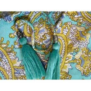 Chelsea & Theodore Pull On Blooming Paisley Tiered Skirt in size M is a stylish addition to any boho chic wardrobe. The skirt features a beautiful paisley pattern in shades of green, making it perfect for casual occasions. Made from chiffon fabric and accented with layered details, this maxi-length skirt has an elastic waist for comfort and ease of wear. Ideal for all seasons, this skirt is a versatile and trendy piece from India, perfect for those looking to add a touch of bohemian flair to their outfit.