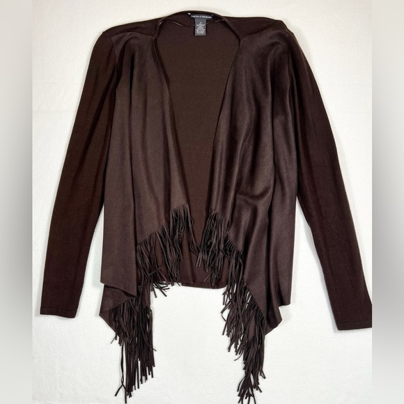 CHELSEA & THEODORE Women’s Faux Suede Open Cardigan Brown Fringe Jacket Size Medium