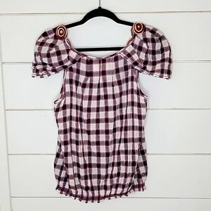 CHELSEA & VIOLET large red black & white plaid cotton top with yarn accents