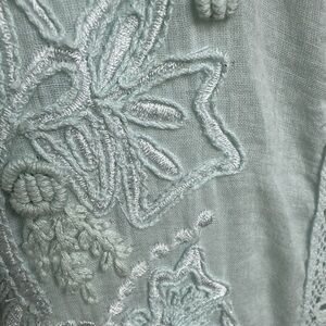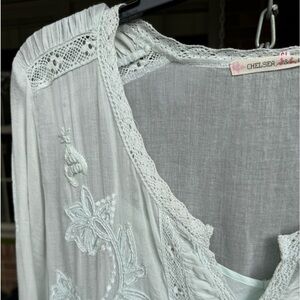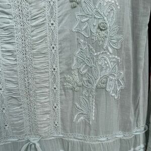 CHELSEA & VIOLET~”SOFT NOSTALGIC” MIDI DRESS~PALE GREEN~LONG SLEEVE~EMBROIDERED COTTON~DROP WAIST~HAS SLIP W/ADJUSTABLE STRAPS~REALLY CUTE~VERY GOOD USED CONDITION