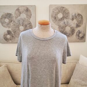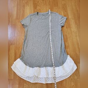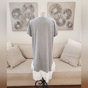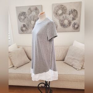 AN104 (tags: t-shirt dress, tshirt dress, shirt dress, knee length, mini dress, Nordstrom, loose, comfortable, casual, grey, gray, heather, white, lace trim, stretchy, sun dress, mixed media, mix media, short sleeve, cap sleeve, crew neck)