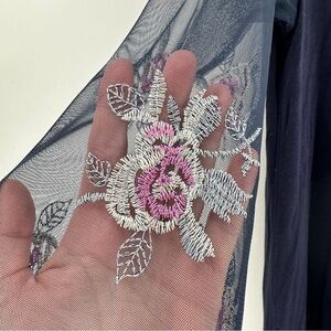 CHENAULT Women’s Navy Blue Top With Floral Embroidered Sheer Sleeves Size Large
