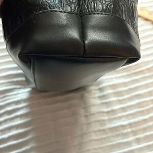 The handle/strap material is also faux leather and the bag is coated with a finish. It is a unique and stylish bag that will complement any outfit.