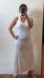 Details: CHERIE D handmade white designer curve hugging maxi dress with v-neck, beautiful embroidered textured fabric, sheer upper back, and slight high-low hem. Fully lined with, built in padding, and a side seam zipper.