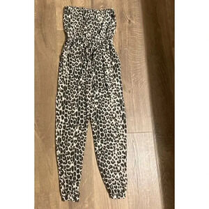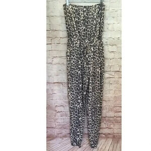 CHERISH Womens Leopard Print Strapless Jumpsuit Waffle Knit Jogger Pockets M