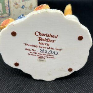 Enseco- Cherished Teddies "Mitch". #269735. Dated 1997. 7h2/233. Original box does show wear. Excellent used condition. No chips, cracks or damages.