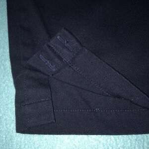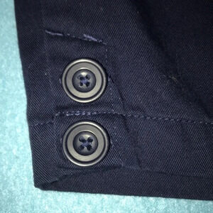 navy blue adjustable shorts with decorative button detail on outside bottom of leg