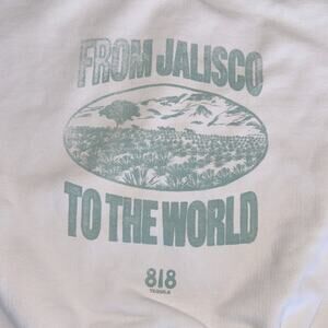 Cream crewneck sweatshirt featuring a teal 'From Jalisco to the World 818 Tequila' print. Comfortable and stylish.