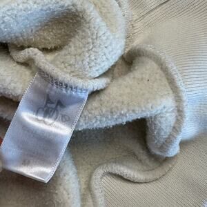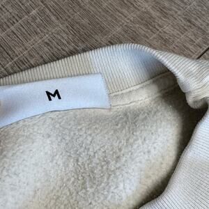 See photos of stain on back of sleeve and near back hem of shirt. Very faint discoloration at neck line.