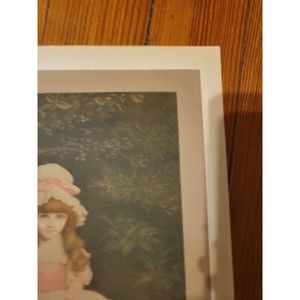 Young child=girl in a white dress with a pink band and matching pink and white bonnet/ hat. Black gloves. Forrest scene.