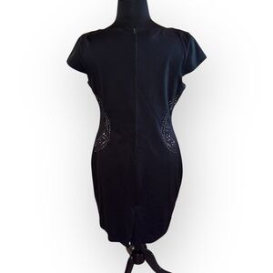 This exquisite black sheath dress by Chesca is perfect for a cocktail night out, featuring a chic crew neck and cap sleeves. The mini length and intricate embellishments add a touch of glamour, making it a standout piece for any evening occasion.