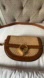 Stylish Italian crossbody bag with a woven tan front and brown leather accents. Features a unique circular clasp and a zipper pocket in the back that holds an iPhone perfectly!