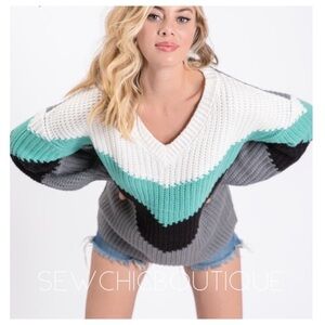 Chevron Cozy Color Block Sweater with Drop shoulder, rubbed cuff sleeves, v-neck and finished with a solid charcoal gray back. The sweater is so soft & will keep you nice & warm for sure. However it’s not an off the shoulder sweater for normal size women. If you are tiny, maybe it will be too big & hang off.