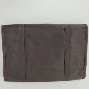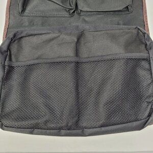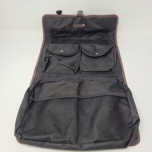 Travel bag with hanger and multiple pockets. Folds close with two exterior buckles