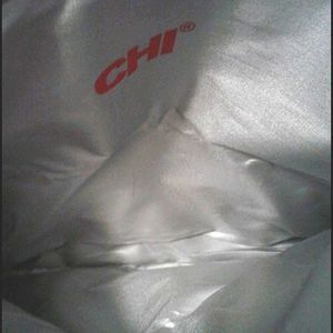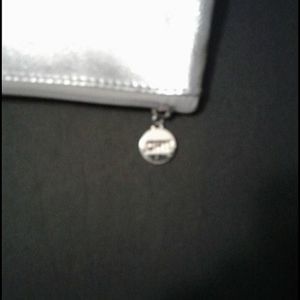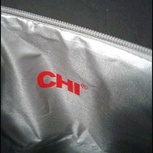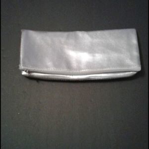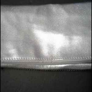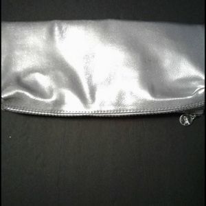Silver cosmetic travel bag with magnet button and inside zipper. Leather outside and plastic insulated interior. It is a convertible bag that can be used folded or in full size.