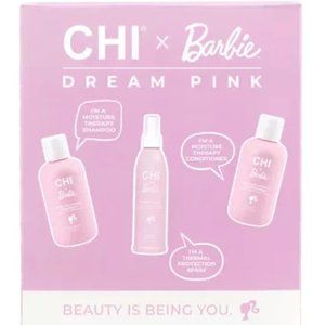 What it Does This kit was specifically designed to help keep your hair healthy, strong, and shiny! Includes CHI x Barbie Dream Pink Moisture Therapy Shampoo 12 Oz CHI x Barbie Dream Pink Moisture Therapy Conditioner 12 Oz CHI x Barbie 44 Iron Guard Thermal Protectant 8 Oz The Moisture Therapy Shampoo combined with the Moisture Therapy Conditioner helps to repair and restore the natural moisture of your hair whileleaving your locks healthy and shiny. The 44 Iron Guard Thermal Protectant provides superior heat protection. All three products are Sulfate Free, Paraben Free, Gluten Free and Cruelty Free