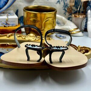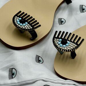 Blue & black bead accented eye motif accentuates these minimalist strappy leather sandals.