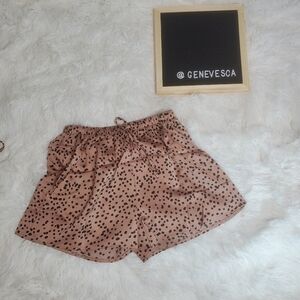 Bronzed 2 piece set with black splatter spots. Stunning satiny two-piece PJ set. Spaghetti strap tank has adjustable straps and sits on the skin so effortlessly. Shorts have adjustable string around the waist for exact fit. 95% Polyester 5% Spandex