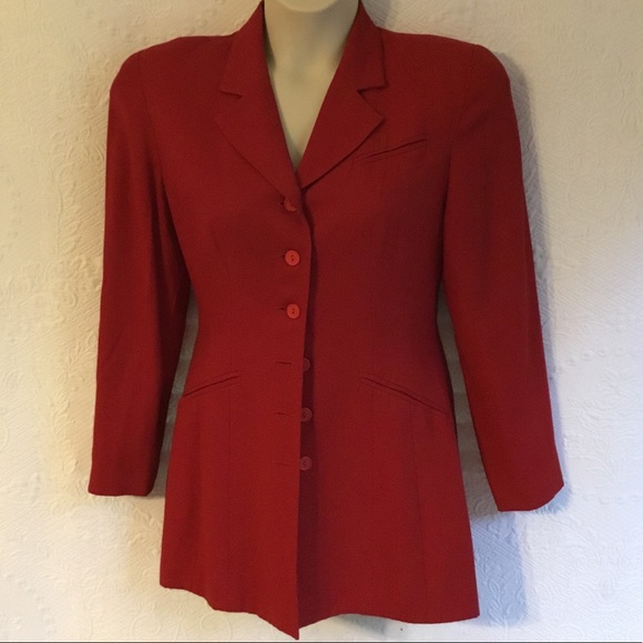 Really beautiful shade of “blue red” (no orange tones). Long Jacket, perfect for leggings and boots. Faux Slit Pockets in Front. Fully Lined. Side Slits. Some minor “pilling” under arms. Armpit to Armpit 19”. Waist seam to Waist seam 16”. Hip seam to Hip seam 20”. Shoulder seam to Hemline 29”. Sleeve Length 24”.