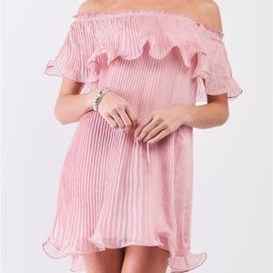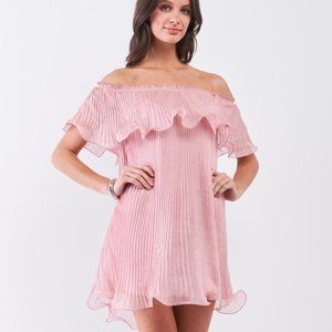 Pink Pleated Off-The-Shoulder Double Layered Frill Trim Mini Dress.