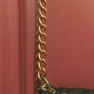 This is a really cute leather cross body purse, perfect for wearing to a concert, party, or club! It's small, but large enough to fit in keys, a wallet, and phone with extra room left. It is not heavy, although the chain looks to be. It goes with almost everything!