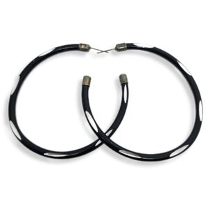 Stylish vintage large hoop style earrings with black enamel detail and diamond cut designs on front side of hoop. Earrings are capped on the ends with silverplated hardware and studs. Earrings measure 2-1/2 inches in diameter. Great condition