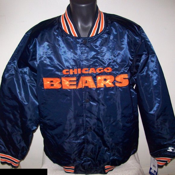 New w Tags CHICAGO BEARS STARTER 1946 FRANCISE Throw back JACKET. High quality polyester Satin Jacket with a snap up front and ribbed knitted cuffs, collar and waist band. The jacket has a polyester outer shell and the inside lining is soft polyester and it is polyfilled. The "CHICAGO BEARS" Lettering & BEARS 1946 Logo meticulously sewn on. New STARTER 2019. Color: BLUE w ORANGE Sewn on Lettering. Satisfaction guaranteed or return. Measurements: S: 23 M: 24" L: 25" XL 26" 2X: 27" across chest.