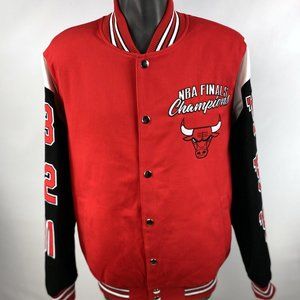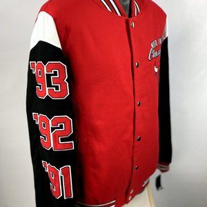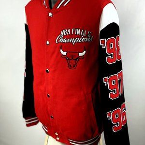 Fall 2022 CHICAGO BULLS 6 TIME NBA FINALS WORLD CHAMPIONSHIP JACKET. Cotton jacket with sewn CHAMP YEARS patches of the 6 NBA FINALS the BULLS won on the sleeves. This is a RED Bulls Jacket with BLACK Sleeves & WHITE Trim. The jacket has 2 exterior pockets & 2 inside pockets. Inside lining is diamond stitched polyester. This is a heavy weight jacket. . All the logos are meticulously sewn on. Jacket has nylon collar, cuffs & waistline. Measurements armpit to armpit S:23" M:24" L:25" XL:26.5 2X: 27.5. Sizing on this style is generous and fits a tad on the bigger side.