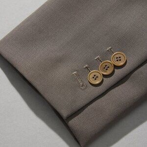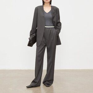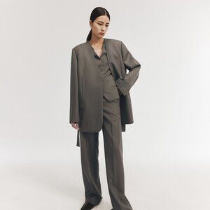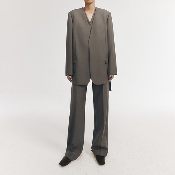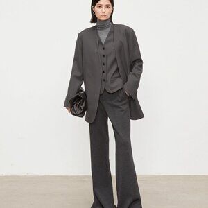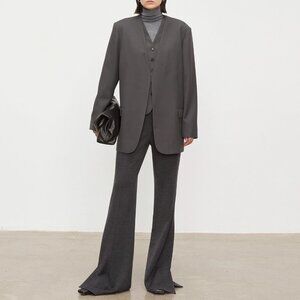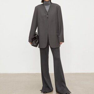 A refined minimalist wool blazer in a modern collarless design. Made from exclusive high density twill wool fabric for a smooth structured drape. The elephant gray color is timeless understated and extremely versatile. A perfect piece for clean tailoring lovers.