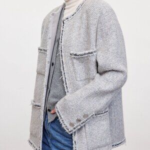 CHICJOC Handwoven Tweed Coat – Moonlight Grey with Night-Sky Sequin Fringe, Size