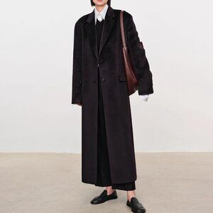 Alpaca offers superior warmth compared to cashmere while maintaining a lightweight feel The ultra dense weave gives the coat a structured drape and insulating power that exceeds expectations The surface shows a flowing natural satin wave pattern low key yet opulent elevating the overall sophistication of the piece