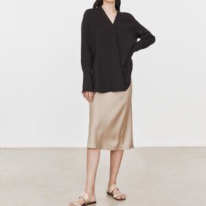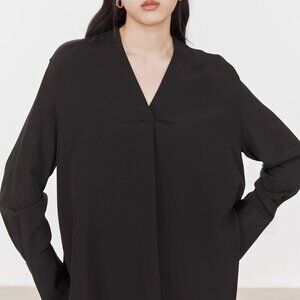 A beautifully made, premium high-density silk blouse featuring a soft sheen, fluid drape, and a modern minimalist silhouette. Crafted from exclusive 6A-grade mulberry silk, this top feels incredibly smooth, lightweight, and luxurious against the skin. The wide cuffs, clean V-neckline, and relaxed shape make it an elevated essential for any wardrobe.
