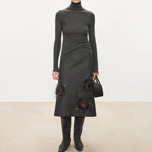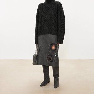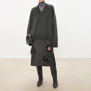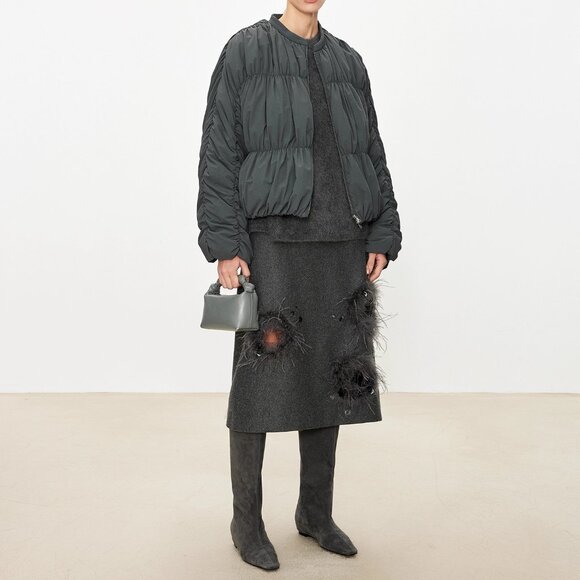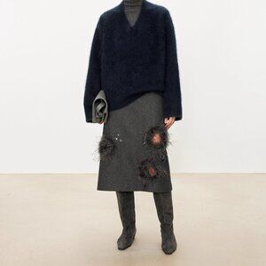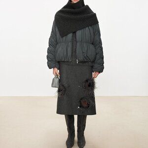 A true statement piece from CHICJOC, this hand-embellished wool midi skirt features rare imported ostrich feathers, mixed sequins, and dimensional appliqué circles crafted entirely by hand. The effect is a sophisticated “smoky fireworks” texture that brings movement, depth, and couture-level artistry to the classic A-line silhouette.