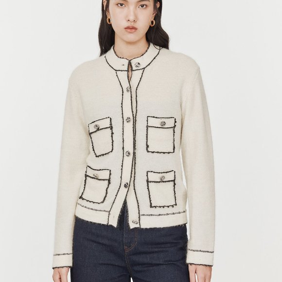 This lovely cardigan has only been worn once for a very short time and is still in excellent condition. The loop for the second button is slightly loose. It has been hanging in my closet, so there may be some very light creasing around the shoulders. Please refer to the photos for details.