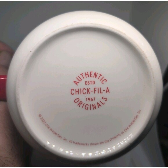 This CHICK-FIL-A Chicken White Ceramic Coffee/Tea Cup/Mug is a large 16 fl oz mug designed for all occasions. The contemporary style features a round shape with a painted design and letters pattern, representing happiness. Made from ceramic and porcelain, this original 2022 LG. branded cup is machine washable and dishwasher safe, making it easy to use. The white color and modern design make it a perfect addition to any kitchen or home decor, serving one person with a drink-through lid for hot or cold beverages. Only one noticeable imperfection on the letter N as shown in the picture. 1