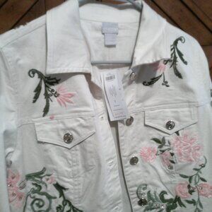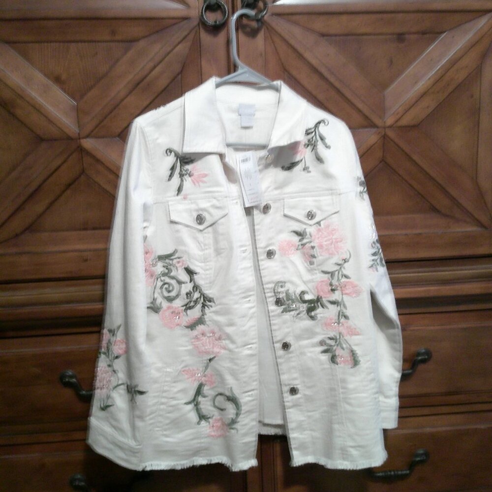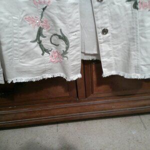 BEIGE DENIM JACKET WITH PINK AND GREEN FLORAL EMBROIDERY WITH SEQUINS