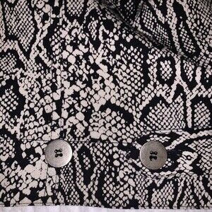 Excellent condition CHICO design women’s snake skin jacket. Sleeves can be worn long, or roll up as it shows in pictures. This is 98% cotton 2% spandex. Has two front pockets. All snaps and buttons are intact and none missing. Very classy! No holes, tears, or stains.