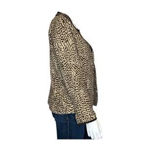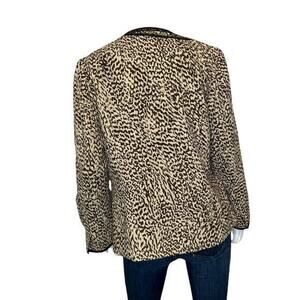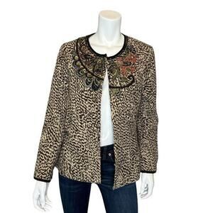 Chicos Leopard Print Microsuede Unlined Jacket with Hook & Eye Closure. Beautiful Floral Embroidery on the Front is Accented with Sequins and Beads. Dark Brown Contrast Trim on Sleeves and Around the Neckline. Women’s Size M Chico’s 1