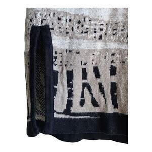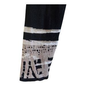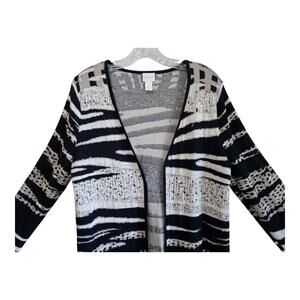 CHICO'S 1 = Women's 8/10 Cardigan Sweater Duster - Open Front, Black, Tan, Gold Metallic, Mixed Patterns, Long Sleeve, 92% Cotton, 5% Polyester, 3% Metallic