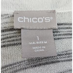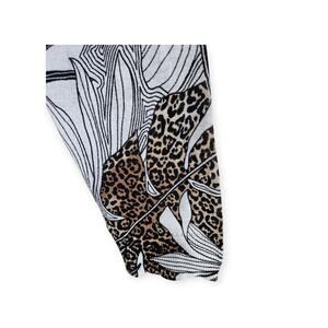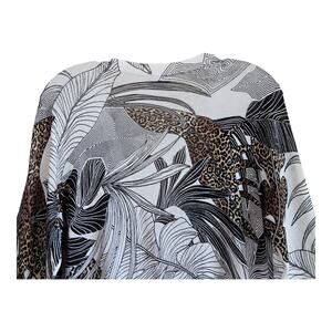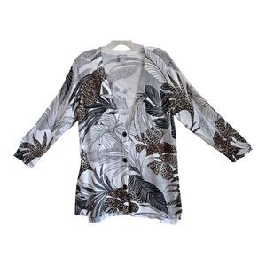 CHICO'S 1 = Women's M 8/10 Cardigan Sweater - V-Neck, Button Up, Black, White, Brown, Leaves, Leopard, Artsy to Wear, Lightweight, 73% Cotton, 27% Nylon