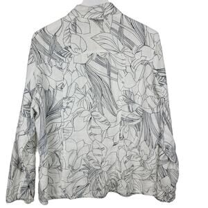 Chico's 100% Linen Black & White Print Button Down Jacket. Patch breast pockets with buttons. Abalone buttons. Floral print.